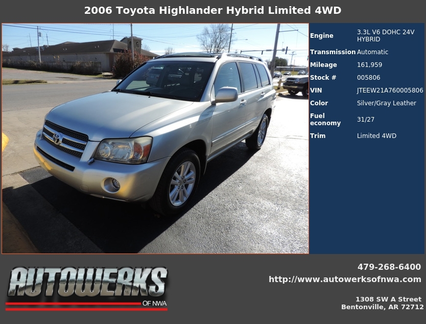 Autowerks Of Nwa Used 2006 Silver Toyota Highlander Hybrid For Sale In Bentonville Ar 72712