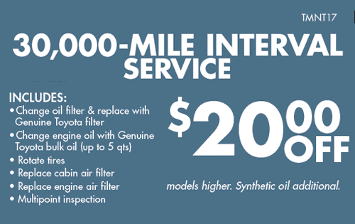 Contact your participating toyota dealer for details. Toyota financial services is a service mark used by toyota motor credit corporation. The toyota 30000 mile service can be slightly different depending on what model you have.